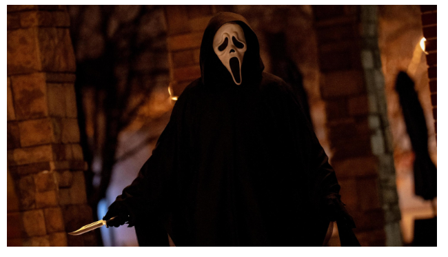 We start the film with a couple, Madison and Scott, arriving at Stu Macher’s house, now turned to Airbnb after the events of SCREAM 5. The inside of the house is filled with memorabilia of the STAB films and facts about the real killings that occurred in the house. We take a 4th wall-breaking walk down memory lane, seeing chalk outlines of the killers from past films. There’s even a Ghostface animatronic with a motion sensor, giving the audience a false jump scare. The scene quickly turns grim as Madison receives a phone call from returning actor Roger L. Jackson, reprising his role as the voice of Ghostface. When returning to the living room with Scott, the once animatronic Ghostface is replaced with a real killer in the costume, as he lunges out and kills Scott with a knife through the head. Our first chase scene of the movie begins as the killer chases Madison through the house and up the stairs. The struggle ensues as Madison tumbles them both off the banister down to the floor below, falling directly onto Ghostface’s knife. While Madison writhes in pain on the floor, the killer starts setting the house ablaze, and eventually Madison is ablaze, walking out the door towards the camera, giving us our 7th title card of the franchise. While an awesome way to kick off the film, we will soon find out it has absolutely no correlation to the plot or the killer’s motive.Β